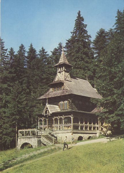 ZAKOPANE. Kaplica w stylu zakopiańskim w Jaszczurówce proj. arch. Stanisława Witkiewicza.