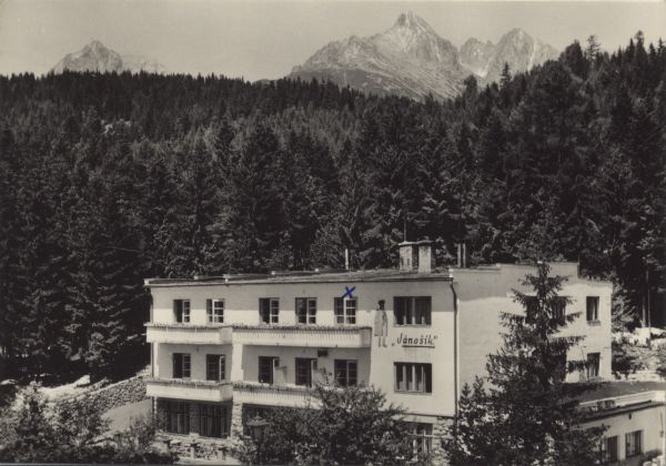 VYSOKÉ TATRY - Tatranská Lesná Zotavovňa ROH Jánošík. V pozadí Prostredný hrot a skupina Lomnického štítu.