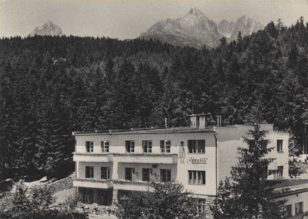 Związkowy dom wypoczynkowy Janosik w Tatrzańskiej Leśnej. W tle las, nad nim po lewej stronie Pośrednia Grań po prawej grupa Łomnicy.