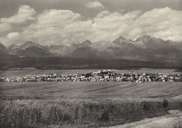 Widok na Szczyrbę i Tatry Wysokie. Na pierwszym planie droga i pola uprawne. W tle panorama Tatr. Od lewej Szczyrbski Szczyt, grań Baszt, Mięguszowieckie Szczyty, Rysy, Wysoka, Tępa, Kończysta i Gerlach.