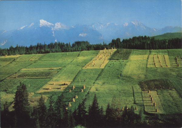 Pejzaż letni. Widok na szczyty Tatr z Bukowiny Tatrzańskiej. Na pierwszym planie pola uprawne.