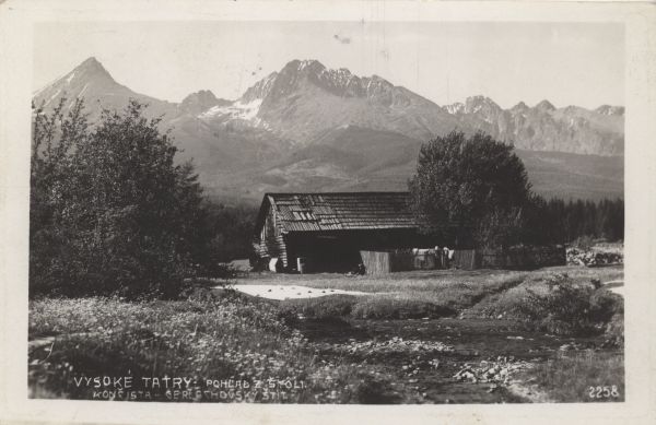 Widok ze Stwoły. Na pierwszym planie drewniany dom, w tle Kończysta i Gerlach. (Na dole odręcznie pisany tytuł pocztówki, po prawej numer autorski).