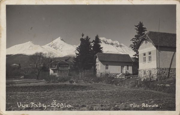 Widok Stwoły. Zabudowania murowane. W tle ośnieżone szczyty: Tępa, Kończysta i Gerlach. (Na dole odręcznie pisany tytuł pocztówki i fotograf).