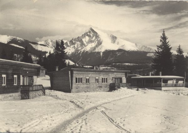 Widok z Podbańskiej na Krywań w zimie. Na pierwszym planie zabudowania w bazie turystycznej.