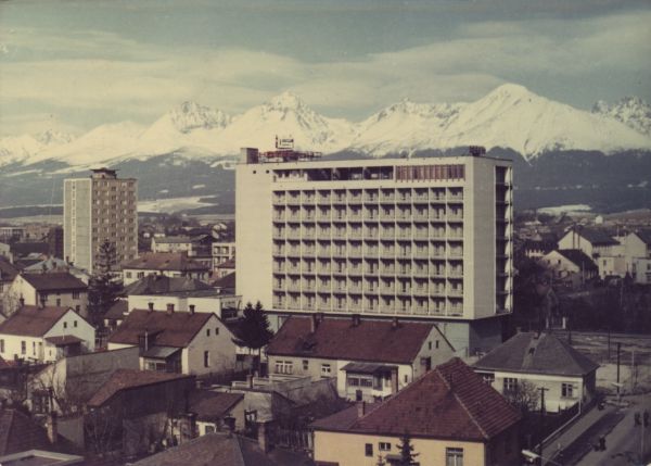 Poprad, Hotel Gerlach. W tle zaśnieżone szczyty Tatr Wysokich.
