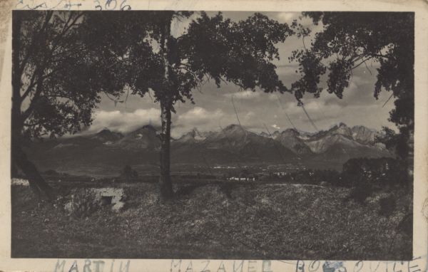 Widok na Tatry Wysokie z Popradu. Od lewej: Kończysta, Gerlach, Sławkowski Szczyt, Po¶rednia Grań, Łomnica, Kieżmarski Szczyt. Na pierwszym planie drzewa, po prawej stronie osady pod Tatrami.