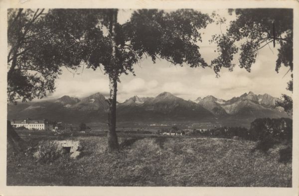 Widok na Tatry Wysokie z Popradu. Od lewej: Kończysta, Gerlach, Sławkowski Szczyt, Po¶rednia Grań, Łomnica, Kieżmarski Szczyt. Na pierwszym planie drzewa, za nimi po lewej stronie budynki w Popradzie, po prawej osady pod Tatrami.