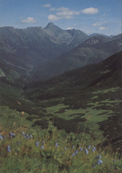Widok na Dolinę Tomanową Liptowska. W tle Dolina Cicha, Dolina Walentkowa i Świnica. Na pierwszym planie dzwonki (Campanula).