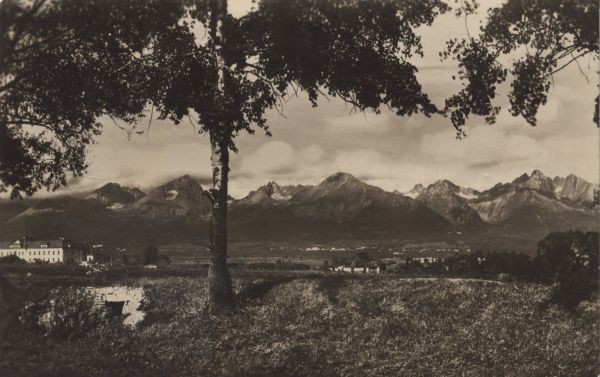 Widok na Tatry Wysokie z Popradu. Od lewej: Kończysta, Gerlach, Sławkowski Szczyt, Po¶rednia Grań, Łomnica, Kieżmarski Szczyt. Na pierwszym planie drzewo, za nim po lewej stronie budynki w Popradzie, po prawej osady pod Tatrami.