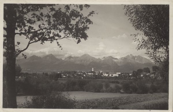 Widok na Poprad i panoramę Tatr Wysokich. Od lewej: Kończysta, Gerlach, Sławkowski Szczyt, Pośrednia Grań, Łomnica i Kieżmarski Szczyt.
