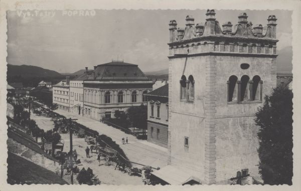 Dzwonnica kościoła pw. św. Idziego z XIII w. w Popradzie i okoliczne budynki.