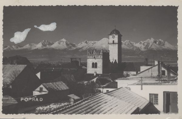 Widok na miasto i kościół pw. św. Idziego z XIII w. w Popradzie. W tle panorama ośnieżonych szczytów Tatr Wysokich.