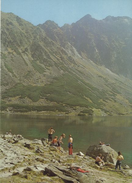 Widok na Czarny staw G±sienicowy, na pierwszym planie grupa turystów odpoczywaj±cych nad stawem. W tle Granaty.