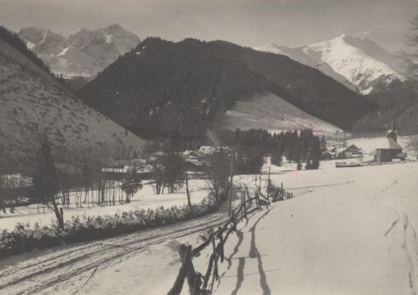 Osada Jaworzyna. Widoczna zabudowa i kościół. W tle ośnieżone Baranie Rogi, Śnieżny Szczyt i Lodowy Szczyt, z prawej Szeroka Jaworzyńska.