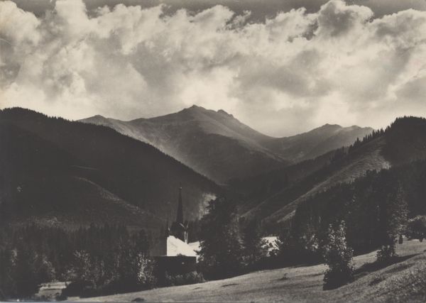 Jaworzyna. W tle masyw Szerokiej Jaworzyńskiej. Na pierwszym planie kościółek ufundowany przez Christiana Hohenlohe.
