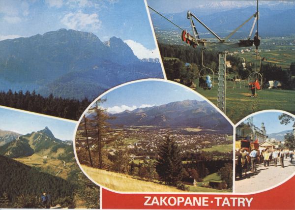 Pocztówka 5 elementowa. Kolejne fotografie przedstawiają: 1. Giewont, 2. Kolej krzesełkową na Butorowy Wierch, 3. Widok z Boczania na polanę Kalatówki i Giewont, 4. Zakopane i panoramę Tatr z Gubałówki, 5. zakopiańskie Krupówki. Pod fotografiami napis: Zakopane - Tatry.
