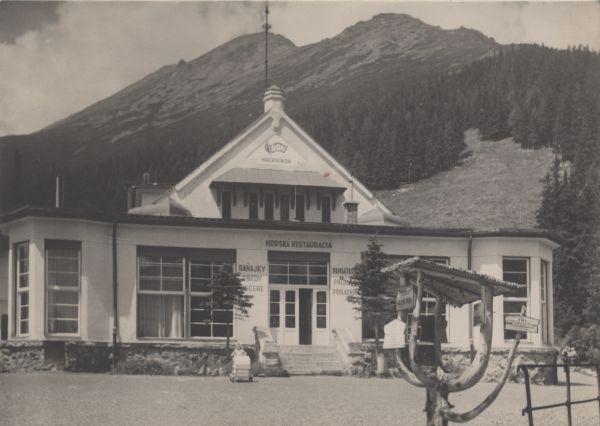 Siodełko. Dom Wypoczynkowy RZZ Hrebienok - restauracja górska. W tle Sławkowski Szczyt.