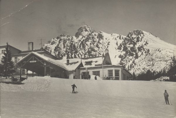 Siodełko. Dom wypoczynkowy RZZ Hrebienok i stacja kolei linowo terenowej na Siodełko. W tle zaśnieżony masyw Łomnicy. Na pierwszym planie narciarze.