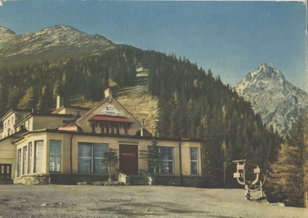 Siodełko. Dom Wypoczynkowy RZZ - restauracja górska. W tle fragment Sławkowskiego Szczytu, po prawej stronie Pośrednia Grań.