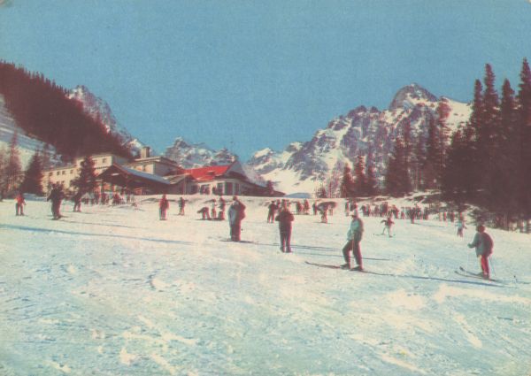 Narciarze na Siodełku. Z tyłu obiekty centrum narciarskiego. W tle Łomnica.