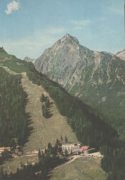 Siodełko. Dom wypoczynkowy Hrebienok. W tle Pośrednia Grań.
