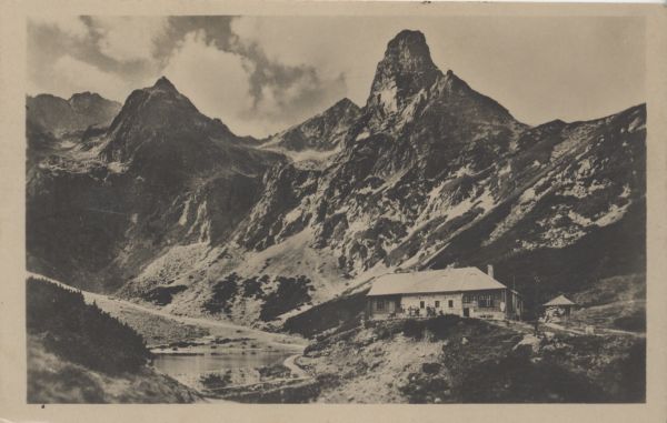 Zielony Staw Kieżmarski. W przodzie schronisko, w tle Czarny Szczyt i Jastrzębia Turnia.