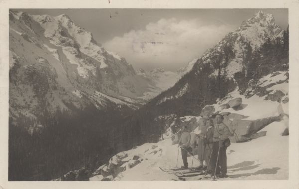 Dolina Staroleśna widoczna z Magistrali Tatrzańskiej w zimie. Na pierwszym planie 4 narciarzy. Z lewej masyw Sławkowskiego Szczytu, z prawej Pośrednia Grań.