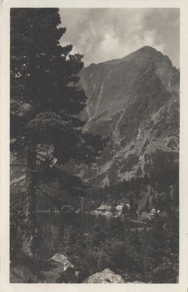 Popradzki Staw ze schroniskiem. W tle Pośrednia Baszta. Na pierwszym planie limba (Pinus cembra L.).