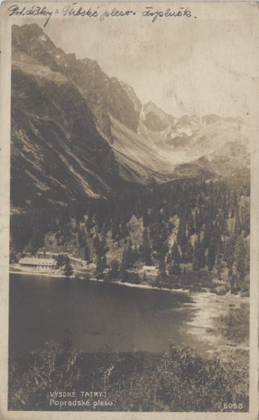 Schronisko nad Popradzkim Stawem. W tle Szatan. Na dole wpisany tytuł. U góry widoczna notatka w języku cz.: Pohádky = Štrbské pleso. Doplněk. (Bajki = Štrbské pleso. Dodatek.).