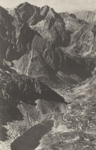 Widok z Małej Wysokiej na Zmarzły Staw pod Polskim Grzebieniem w Dolinie Litworowej. W tle Rysy i Ciężki Szczyt.