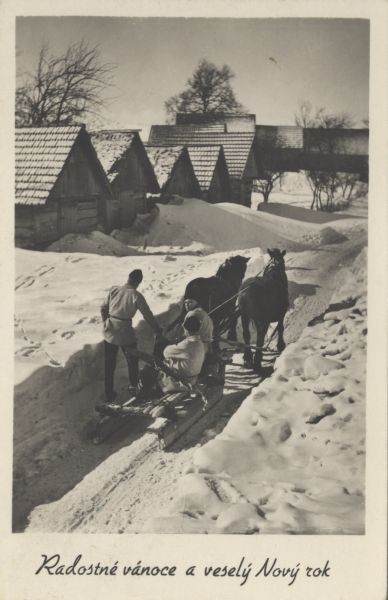 Wieś podtatrzańska zimą. 3 górali na saniach zaprzęgniętych w 2 konie. W tle zabudowania wiejskie. Pod zdjęciem życzenia: Radostné vánoce a veselý Nový rok.