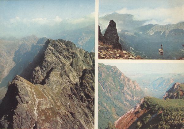 Pocztówka 3. elementowa, na której przedstawiono: 1) Orlą Basztę, Buczynowe Turnie, Dolinę Pańszczycy 2) południowe stoki Wołoszyna, Dolinę Roztoki, 3) Dolinę Kasprową z koleją linową.