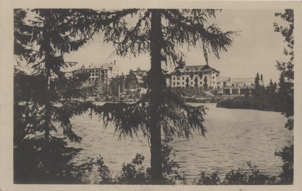 Szczyrbskie Jezioro. Nad brzegiem budynki sanatoriów i hoteli. Na pierwszym planie drzewa.