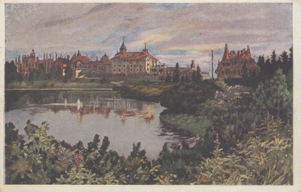 Szczyrbskie Jezioro z budynkami sanatoriów. Pocztówka wg obrazu E. Kosy.