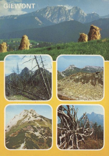 Pocztówka 5. elementowa. Widoki na Giewont: Z pasma Gubałówki, na pierwszym planie kopy siana