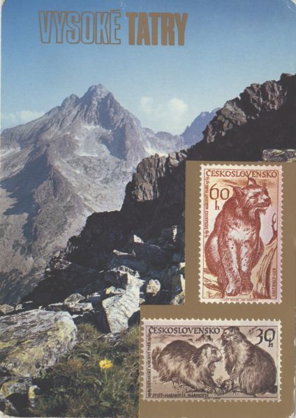 Widok na Wysoką z Tępej. W prawym dolnym rogu 2 znaczki pocztowe przedstawiające rysia i świastaki - autorstwa: J. Balaž, rys. J. Mráček i B. Housa.