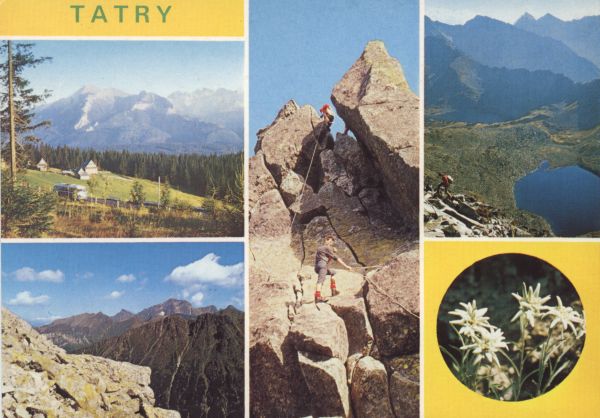 Pocztówka 5. elementowa. U góry tytuł "TATRY". Na zdjęciach: Panorama Tatr Bielskich z Głodówki