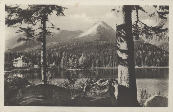 Szczyrbskie Jezioro. Z lewej strony willa Marina, w tle Solisko.