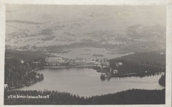 Widok na jezioro i osadę Szczyrbskie Jezioro ze Skrajnej Baszty. Na dole wpisany tytuł.