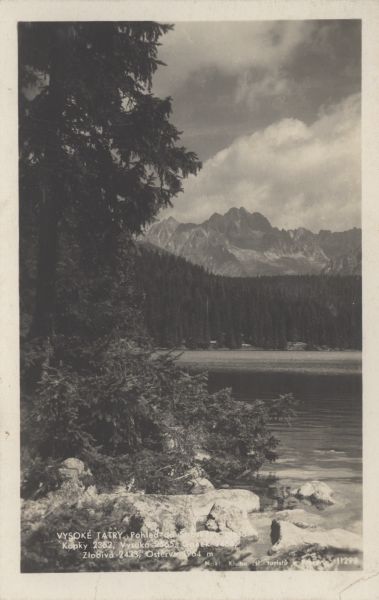 Widok znad Szczyrbskiego Jeziora na Kopę Popradzką, Wysoką, Ganek, Żłobisty Szczyt i Osterwę. Na dole wpisany tytuł i nazwa nakładcy.