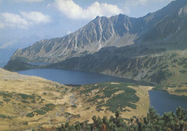 Fotografia przedstawia Dolinę Pięciu Stawów Polskich, widoczne są Przedni Staw Polski, Wielki Staw Polski oraz Czarny Staw Polski. W tle Niedźwiedź i Opalony Wierch.