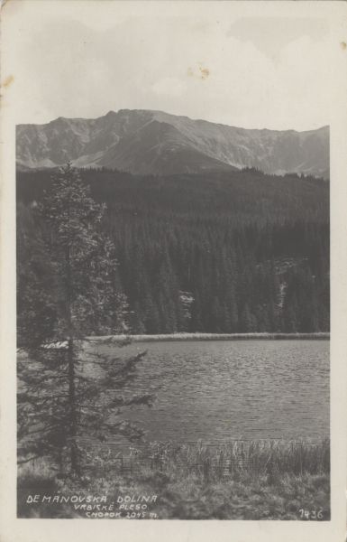 Dolina Demianowska: Wrbicki Staw, w tle Chopok. Na dole po lewej stronie wpisany tytuł.