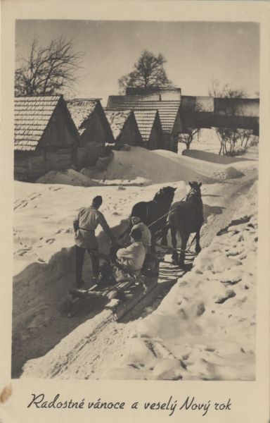 Wieś podtatrzańska zimą. 3 górali na saniach zaprzęgniętych w 2 konie. W tle zabudowania wiejskie. Pod zdjęciem życzenia: Radostné vánoce a veselý Nový rok.