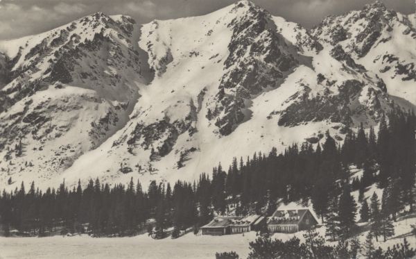 Schronisko nad Popradzkim Stawem w zimowej scenerii. W tle: Skrajna Baszta, Zadnia Baszta i Szatan.