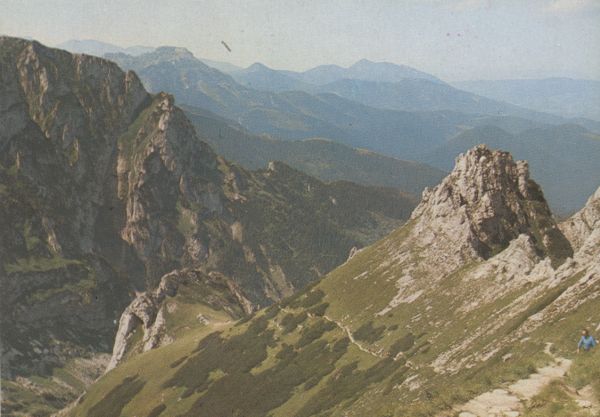 Pocztówka przedstawia Tatry Zachodnie widoczne ze ścieżki na Giewont. Na pierwszym planie ścieżka na Giewont. W tle widoczne Siodło, Siodłowa Turnia, Wielka Turnia, Kominiarski Wierch.