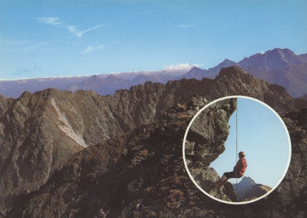 Pocztówka dwu elementowa. Główne zdjęcie przedstawia widok ze Świnicy w kierunku Orlej Perci, w tle Tatry Bielskie i Lodowy. W okrągłym oknie widoczny jest taternik w czasie zjazdu na linie.