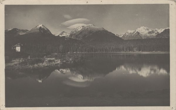 Widok Szczyrbskiego Jeziora z odbijającymi się wodzie ośnieżonymi szczytami. Od lewej: Wielkie Solisko, Szczyrbski Szczyt, Skrajna Baszta, Kopa Popradzka i Wysoka. Na brzegu jeziora willa Marina.