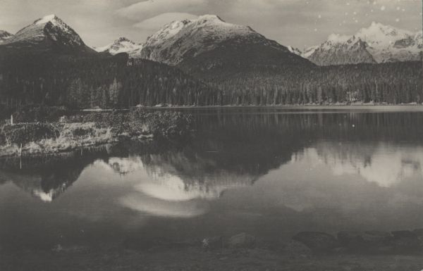Widok Szczyrbskiego Jeziora z odbijającymi się wodzie ośnieżonymi szczytami. Od lewej: Wielkie Solisko, Szczyrbski Szczyt, Skrajna Baszta, Kopa Popradzka i Wysoka. Na brzegu jeziora willa Marina.