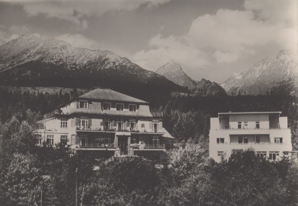 VYSOKÉ TATRY - Hornę Smokovec (1000 m) Zotavovòa ROH Partizán V pozadí Slavkovskę čtít (2453 m), Prostrednę hrot (2440 m) a skupina Lomnického čtítu