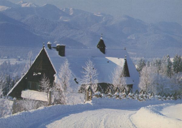 Panorama Tatr Zachodnich wykonana z drogi prowadzącej z Kościeliska na Gubałówkę. Sceneria zimowa. Na pierwszym planie zabudowania WDW Salamandra.